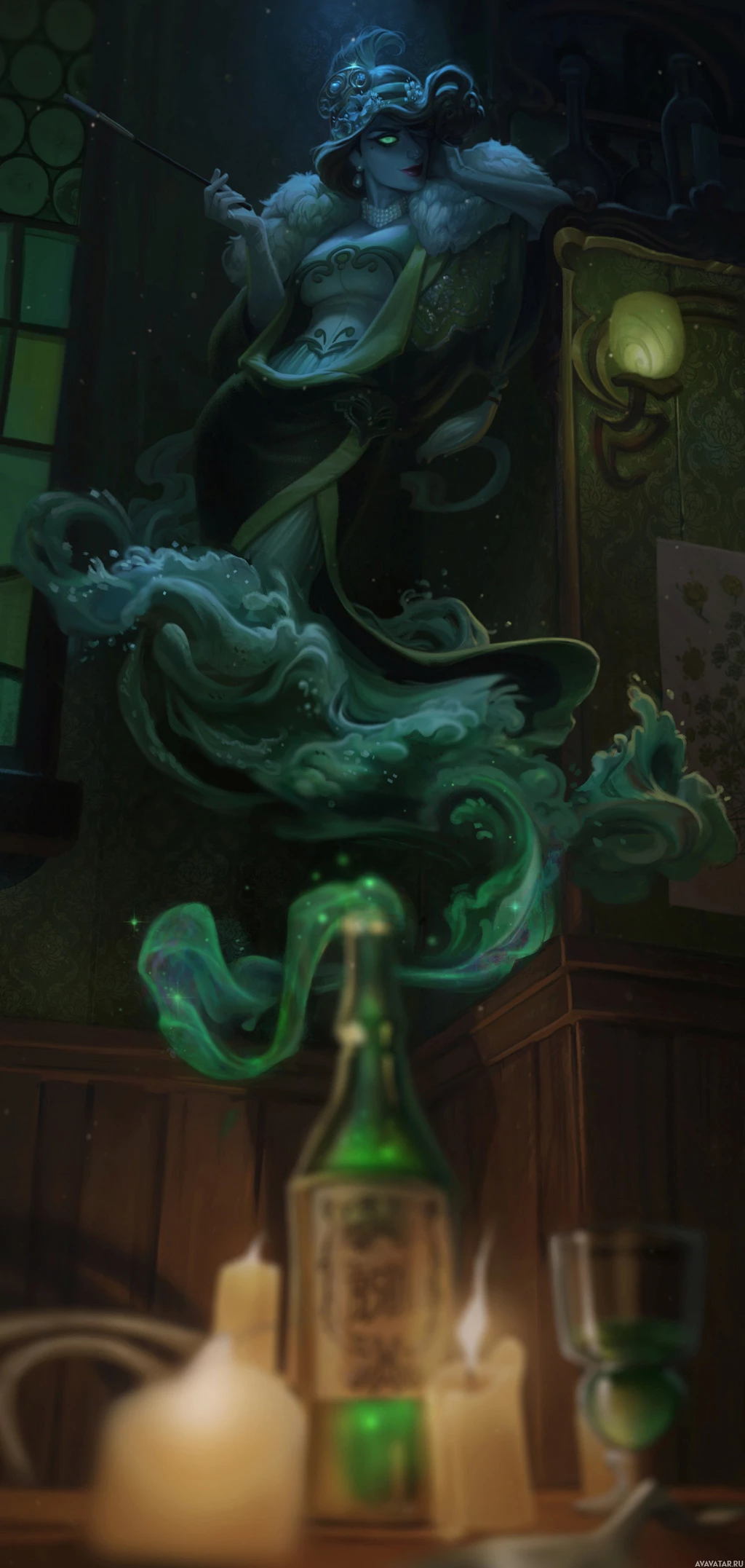 На картинке изображена фантастическая сцена с участием девушки, похожей на русалку. У нее рыбий хвост и чешуя, что наводит на мысль о том, что она русалка или какое-то другое морское существо. Она находится в помещении, напоминающем бар или таверну, о чем свидетельствует наличие бутылок на столешнице и чего-то похожего на свечи и бокалы для вина. Общая атмосфера очаровательна и причудлива, что вписывается в рамки фантастического художественного произведения.
