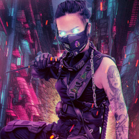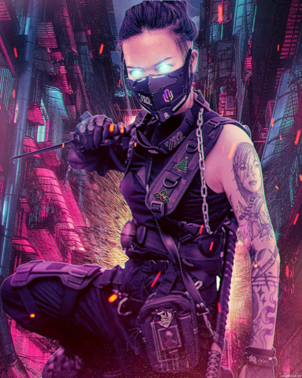 neon lights and digital interfaces. Her attire includes military-style clothing with armor panels and