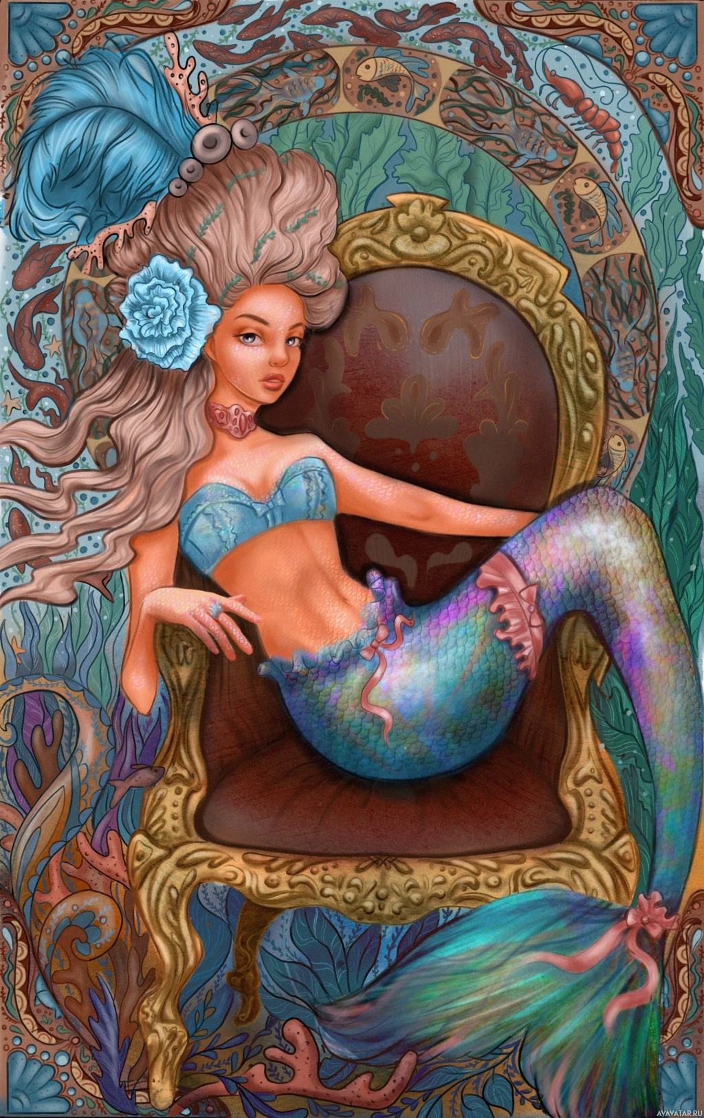 The image depicts a stylized illustration of a mermaid sitting on a chair. She has