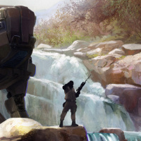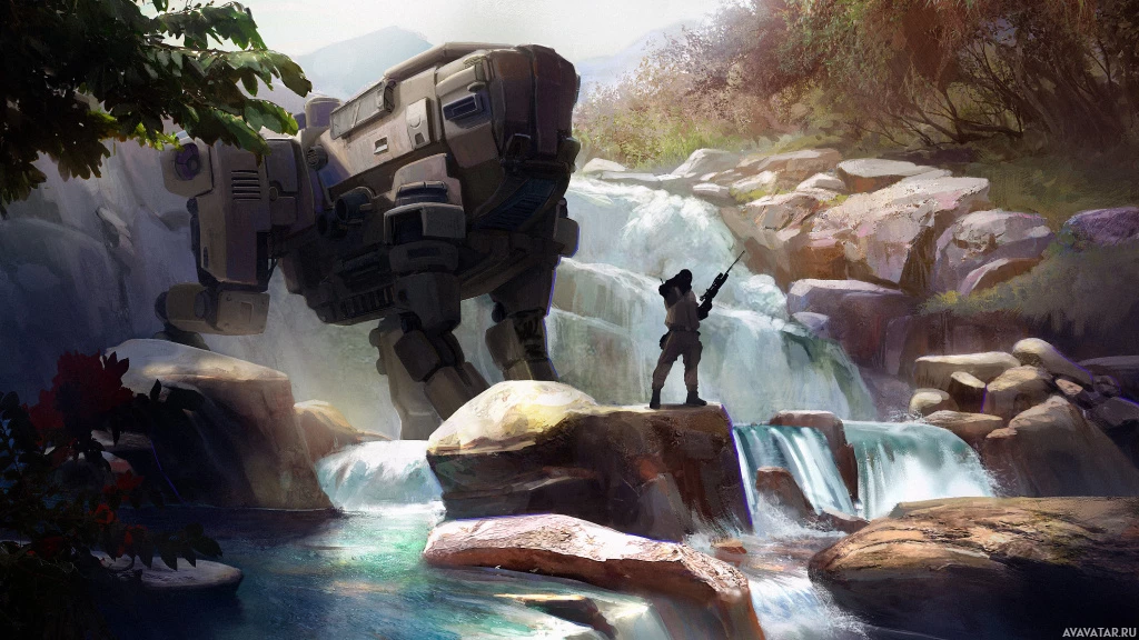 На картинке изображена научно-фантастическая сцена, в которой солдат стоит на скалах у текущей реки, лицом к лицу с бронетранспортером или машиной, похожей на танк. Кажется, что все происходит на природе с водопадами и пышной растительностью. Присутствие бронетранспортера наводит на мысль о футуристическом или антиутопическом контексте, где технологии и взаимодействие людей сосуществуют в естественной среде.