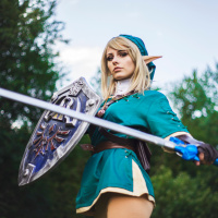 the iconic weapons associated with this character. The costume includes a tunic with the color scheme of green and gold, which are characteristic of Link's