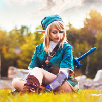 The image features a person dressed in a costume inspired by the character Link from the game "The