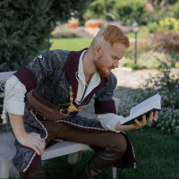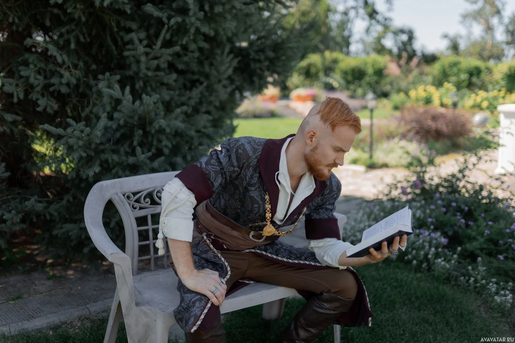 an outdoor bench. The attire includes elements associated with medieval or fantasy characters, such as puffy sleeves and what appears to be a belt or sash with
