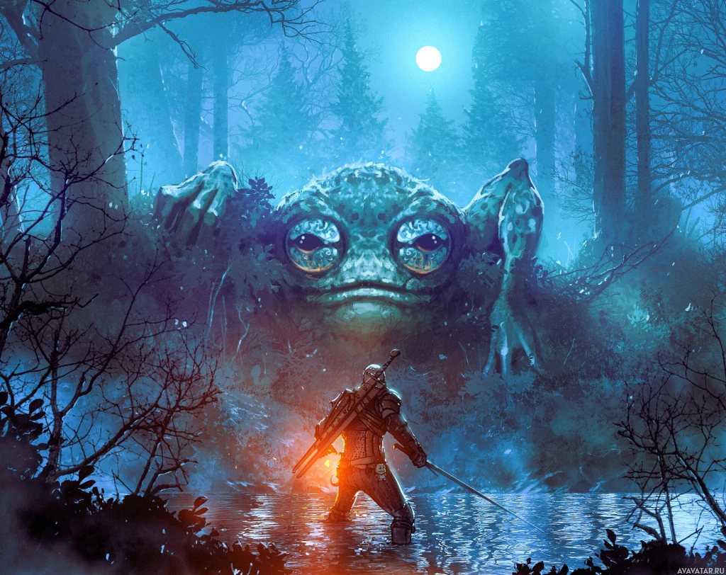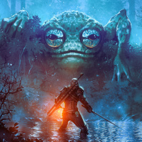 menacing monster with an amphibian appearance, possibly a Leshen or another type of creature from the game's universe. The setting appears to be a forest at night, with