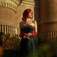 a long dress with intricate detailing and what appears to be a costume or cosplay inspired by "The Witcher" game. Specifically, they resemble