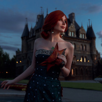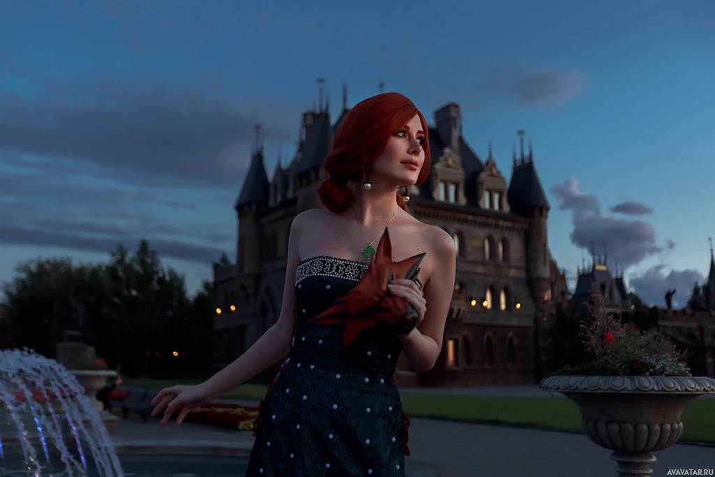 intricate patterns, a headpiece that resembles Triss's hairstyle and accessories, and what seems to be a sword or staff that matches the character's theme. The person is standing outdoors at dusk, as indicated by