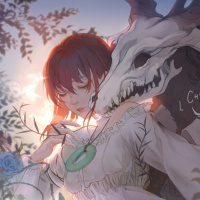 red hair, her eyes are closed as she seems to be in a peaceful or content state. She is hugging another character that has an unusual appearance: it has a skull's head instead of a human-like face. This second character could be interpreted as