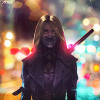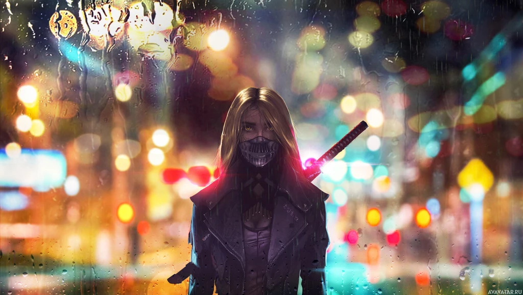 blonde hair, wearing a mask that covers the lower half of her face. She is standing amidst what seems like a neon-lit