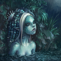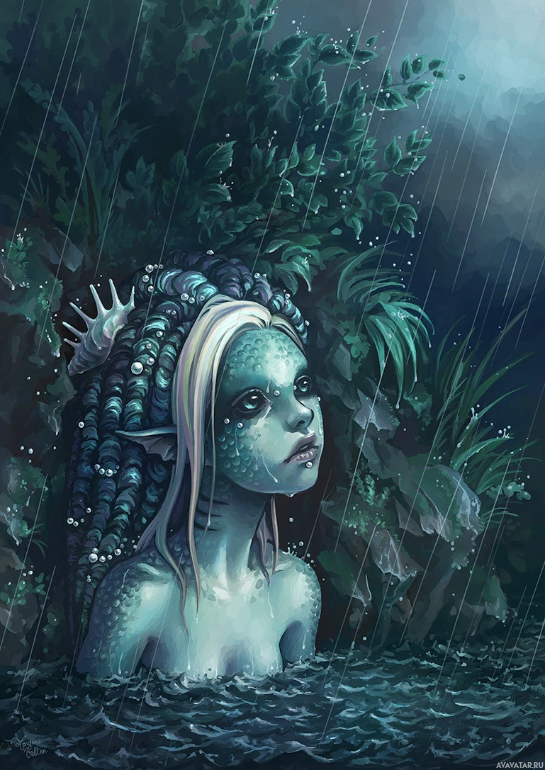 underwater vegetation, possibly in a lagoon or sea. Her hair is blonde and styled with tendrils that give her an ethereal appearance. The background suggests it's raining, with droplets visible falling onto the leaves around her head. This scene captures