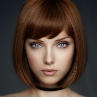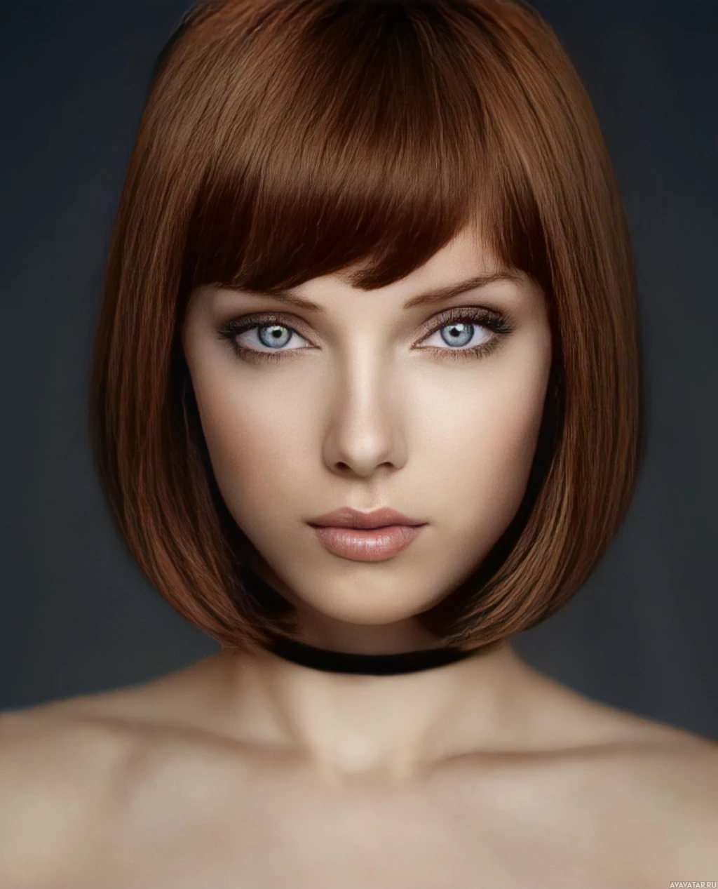 a short haircut, bangs, and is wearing makeup that highlights her eyes and lips. Her expression is neutral, and she is looking directly at the camera. There appears to be some sort of graphic or