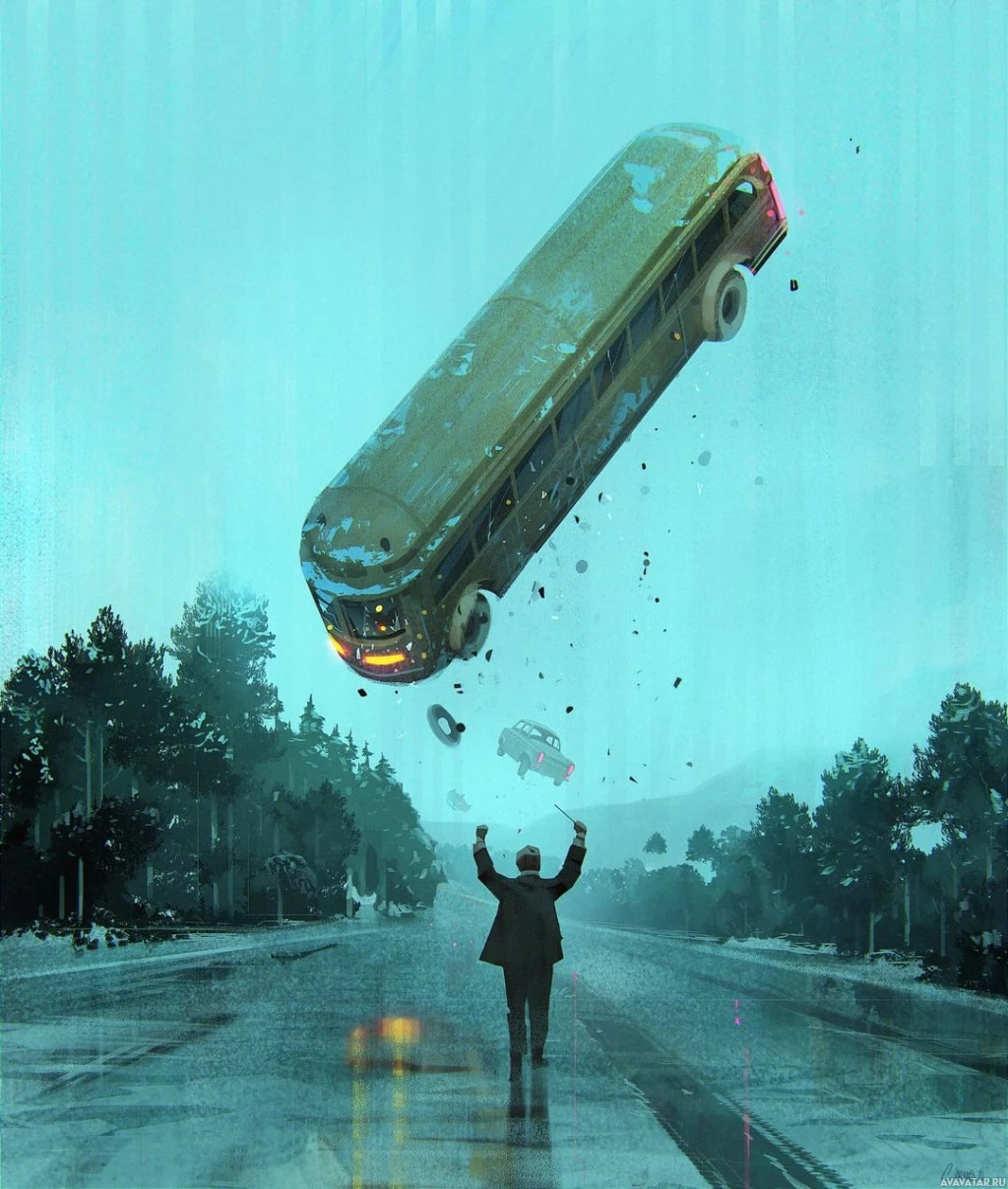 a dramatic scene where a large, yellow school bus is flying through the air from behind, as if it's been launched out of control. In front of the bus, there is a person standing on what appears to be a street or sidewalk, looking up at the sky with their arms raised. This scene creates an unusual and surreal visual effect that blends elements of