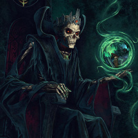gothic attire and is seated on what seems to be a throne. The individual has a skull for a head and is holding a staff adorned with glowing
