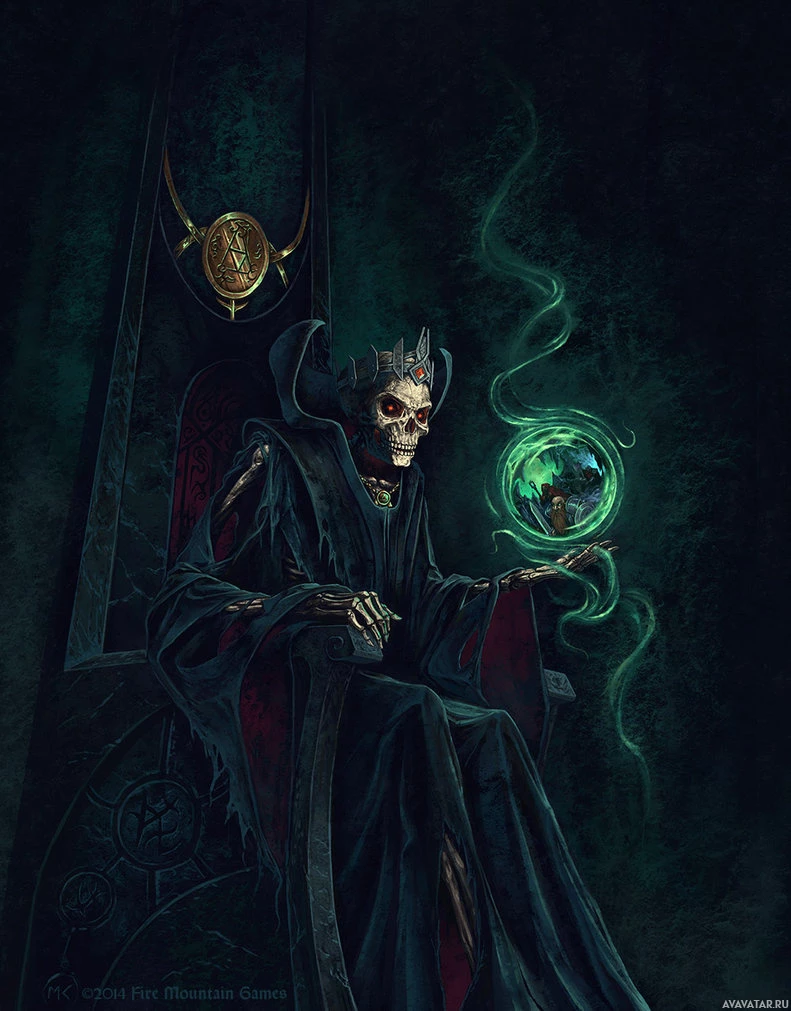 The image depicts a fantasy-themed artwork featuring an ominous figure that appears to be a skeleton or a representation of