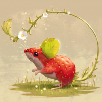 large ears and a small snout, but is dressed in a strawberry outfit complete with a leafy hat. The mouse appears to be engaged in some