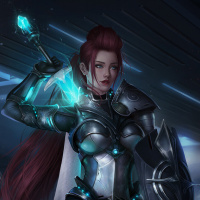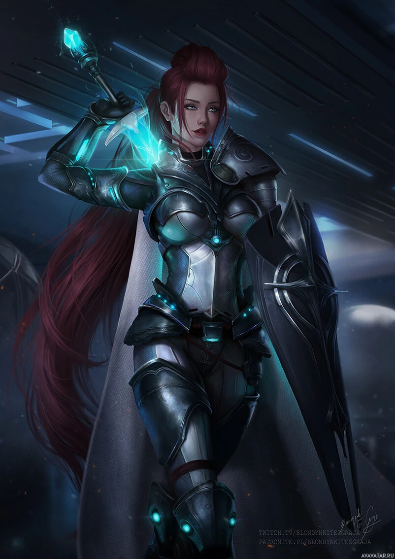 red hair. She is wearing armor and holding a sword, suggesting she could be from a fantasy or science