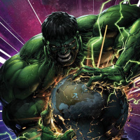 green skin and is holding a representation of Earth in one hand. Surrounding him are energy-like effects that suggest power or transformation, which is consistent with his ability to change between