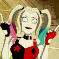 Harley Quinn from the movie "Suicide Squad". She is wearing her signature outfit, which includes a black and red costume with pink highlights, face paint resembling her comic book counterpart, and