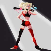 Harley Quinn, a comic book villain often associated with the Batman universe. She is drawn in stylized fashion typical of modern