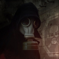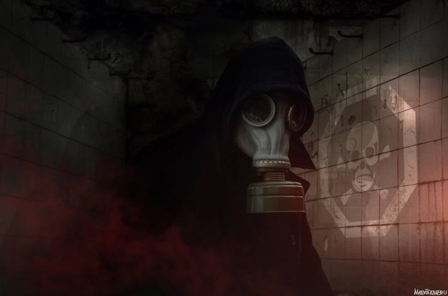 The image shows a person wearing a hood and respirator. The environment appears to be an industrial or underground setting with concrete walls and a barred window that lets in
