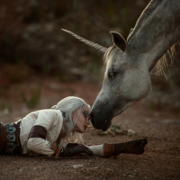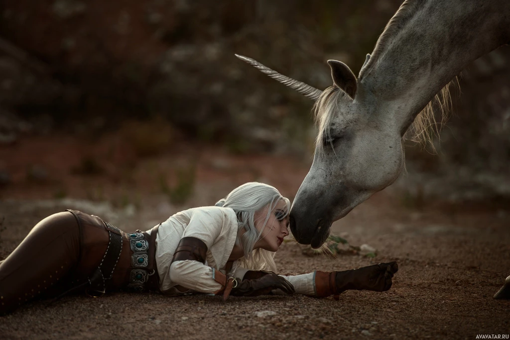 a person in costume, likely portraying the character of Ciri from "The Witcher" game. They are lying on the ground and appear to be kissing or interacting with a horse's nose. This scene is often associated with cosplay culture, where fans dress up as characters from