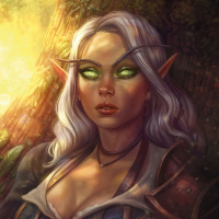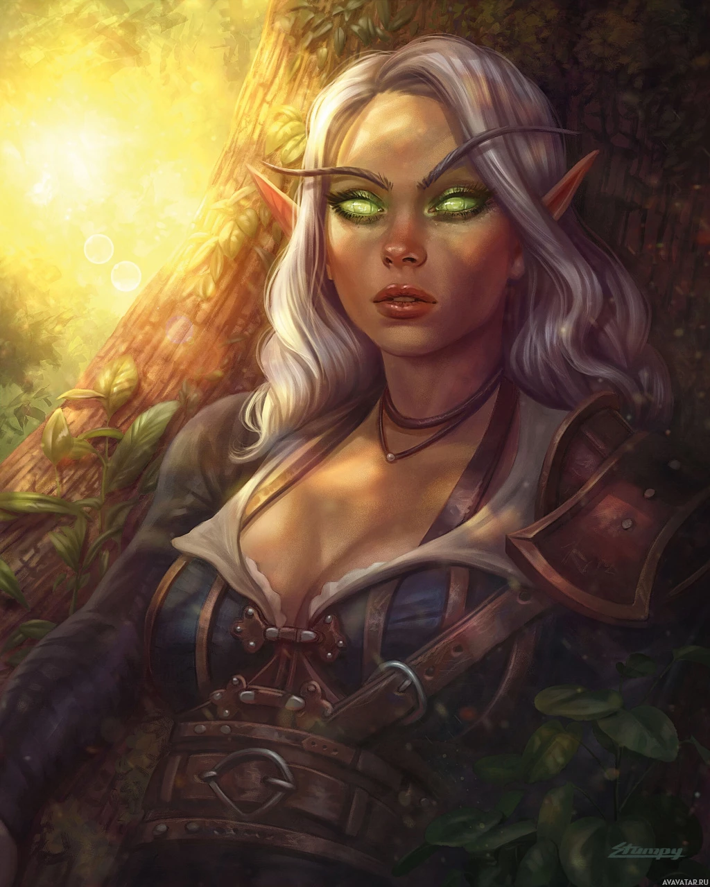 a fantasy character with white hair, resembling an elf. The character is depicted in what appears to be a jungle or