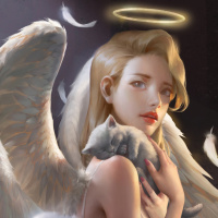 white wings and is wearing a halo, which indicates her celestial nature. She appears to be in a serene or contemplative pose while holding the cat, who seems calm and content with the angel's embrace. The overall atmosphere of the image is ethereal and whimsical, fitting into the fantasy genre.