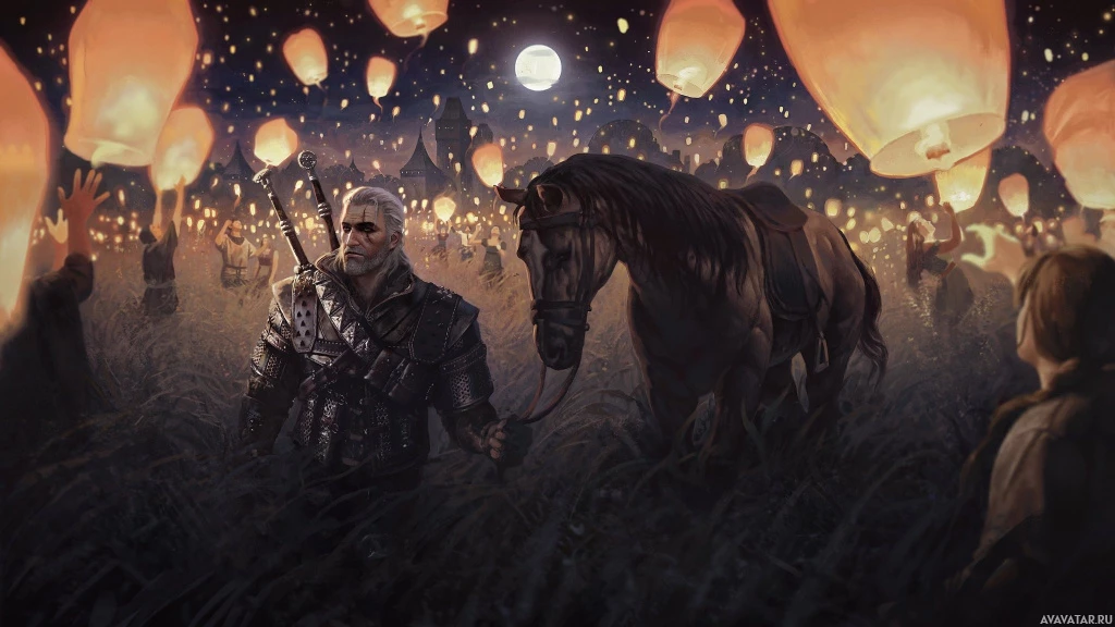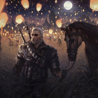 a full moon in the sky, creating a serene and magical atmosphere typical of fantasy-themed games like "The Witcher."