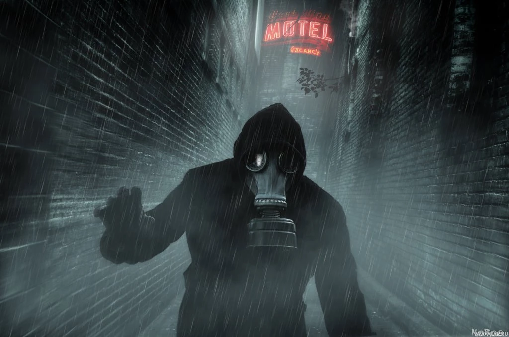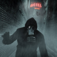 a respirator mask. They are holding what looks like a weapon or a tool with their right hand. The background features a dimly lit street at night, possibly in