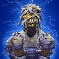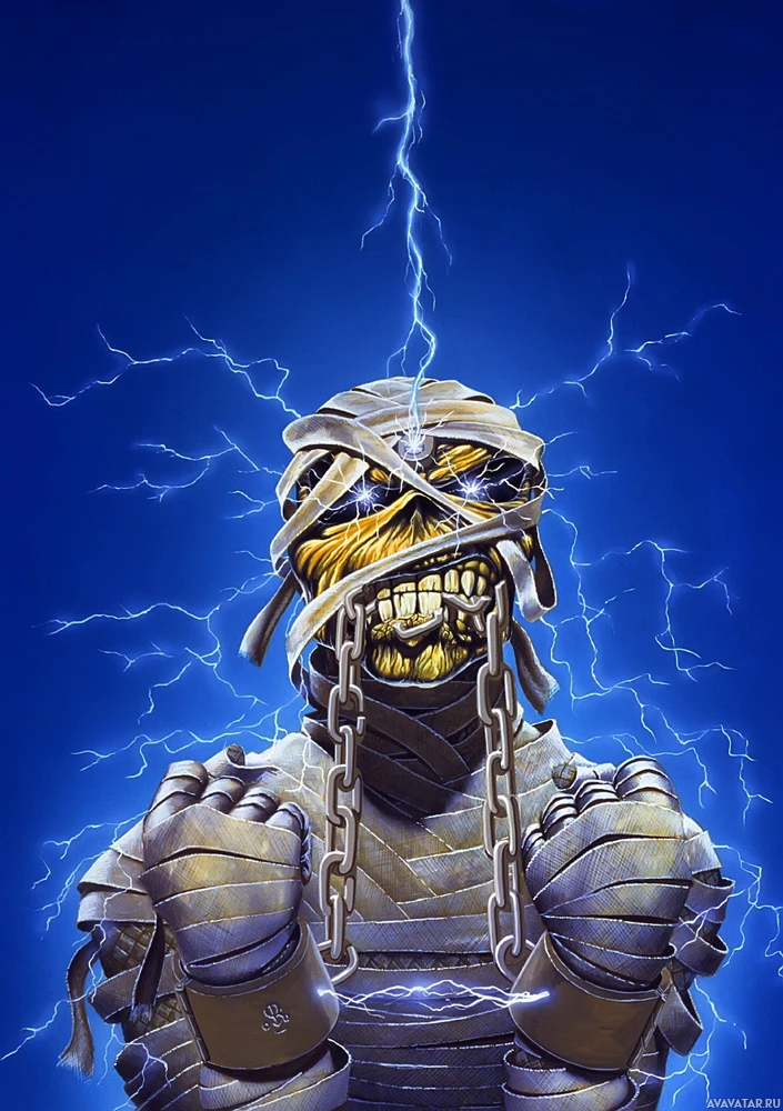 horror movies. It has wrapped bandages, giving it a mummified appearance, and is holding chains in its hands. The background has a dramatic