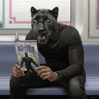 a comic book titled "Black Panther" in their hands. The panther mask covers the entire face, giving an animal-like appearance.