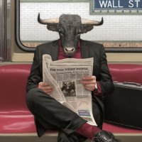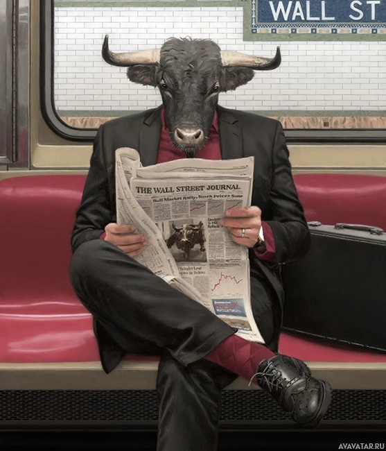 the head of a bull or buffalo, commonly known as a "bull mask" or "bull head." This gives an unusual and humorous appearance to the scene. The person appears to be focused on their reading, seemingly undistracted by the absurdity of wearing such a mask in public.