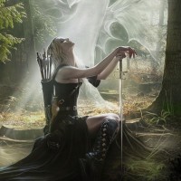 a misty forest setting with trees and what appears to be an ethereal atmosphere. The girl is holding a bow, which suggests she might be involved in archery or hunting activities typically associated with