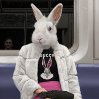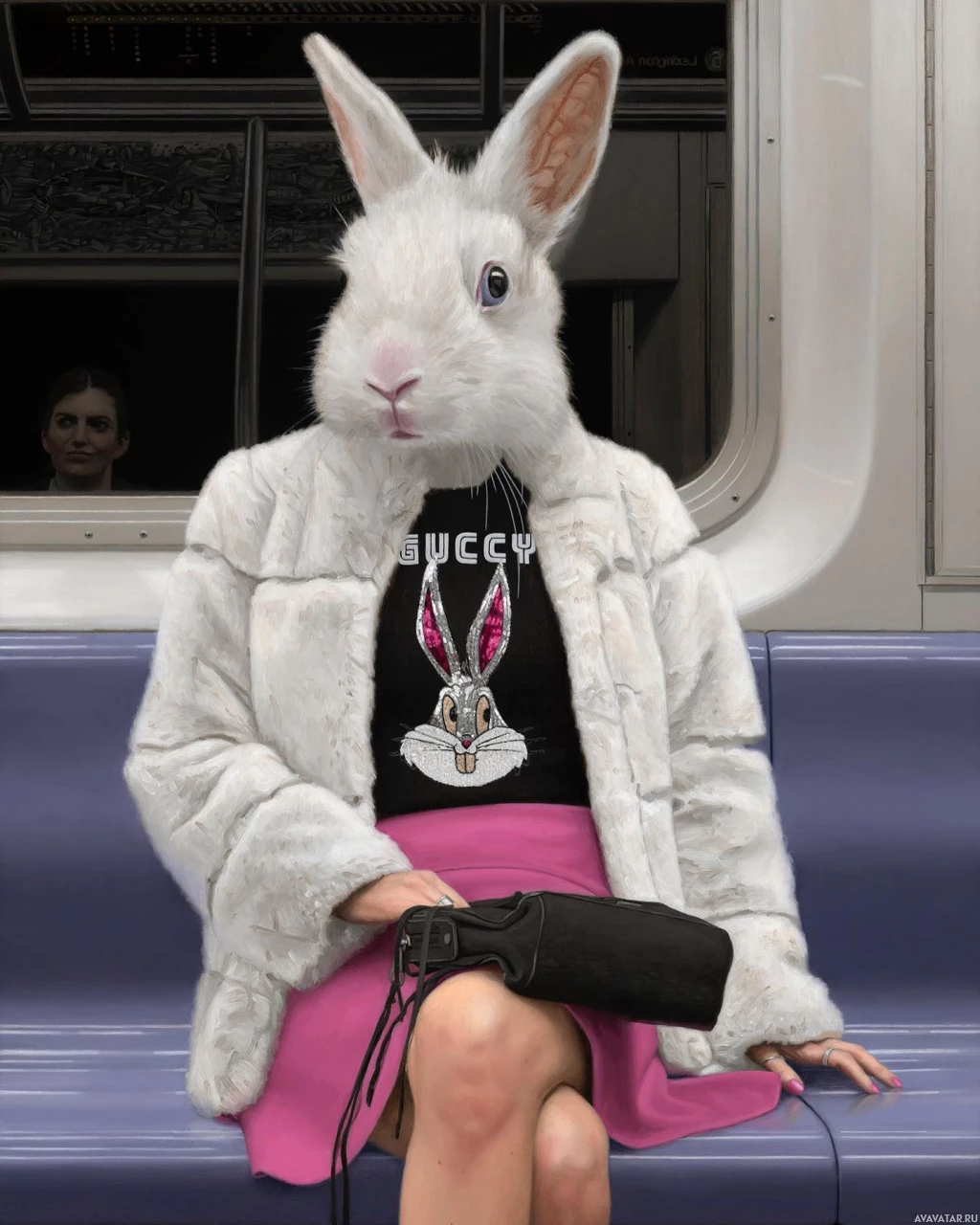 bunny attire, which includes the head of a rabbit and ears. They are sitting on a public transit bench, presumably on a subway or train, as indicated by the presence of a seat and handrails that resemble those found on