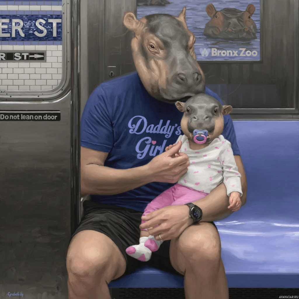 The image shows a person dressed in a hippopotamus mask while sitting on