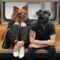 a red circle, which typically signifies the train's route or service number. The image conveys a sense of companionship and urban life shared between different species.