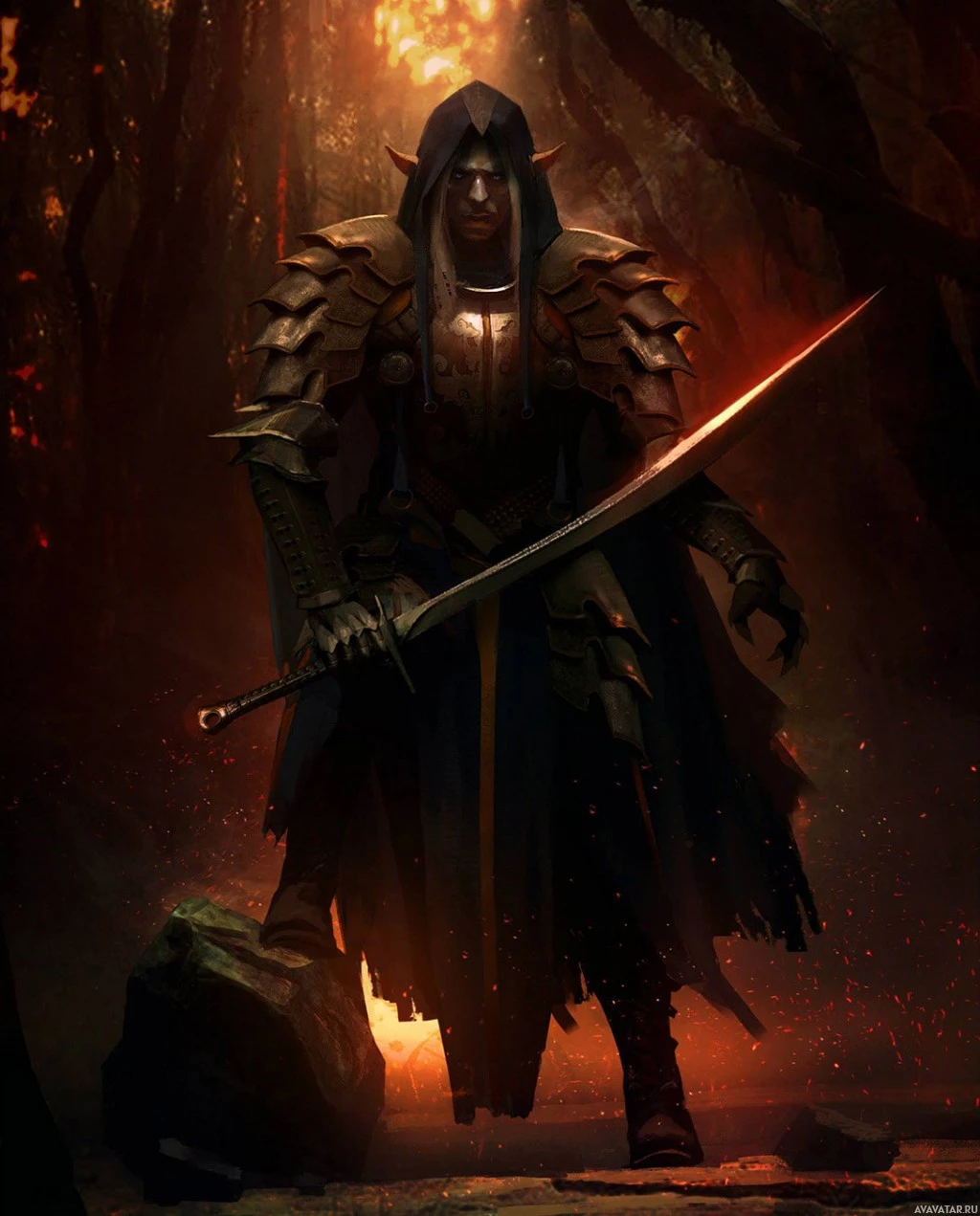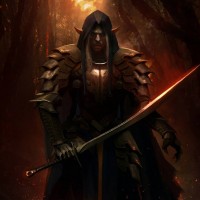 a fantasy scene featuring an elf character. The elf is wearing armor with a cloak and is holding a sword in one hand, suggesting they are ready for combat or adventure. The setting appears to be a forest with dark, ominous elements such as fire and smoke, which could indicate danger or