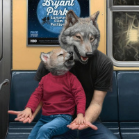 a bench with a child on their lap. Both individuals are wearing wolf masks, giving the appearance of having