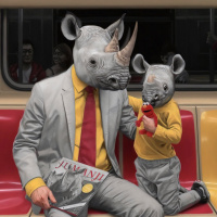 an animal mask, specifically a rhino mask, sitting on a subway train. Another person is present in the scene as well, presumably the child referred to in your description. The setting appears to be a public