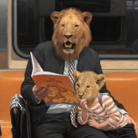 the head of a lion or a tiger, with visible ears and facial features. Accompanying him is a child who appears to be listening intently to the story being read. In the background, there are other