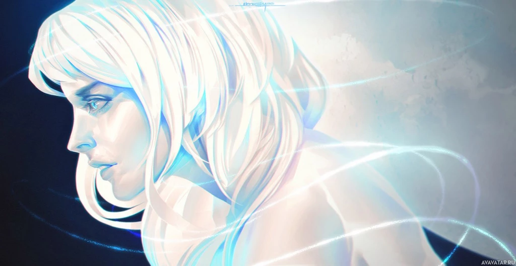 a female character with white hair. She appears to be looking downward and has an ethereal quality, possibly suggesting a supernatural or fantasy theme. The background is dark, which contrasts with her pale skin tone. There are abstract