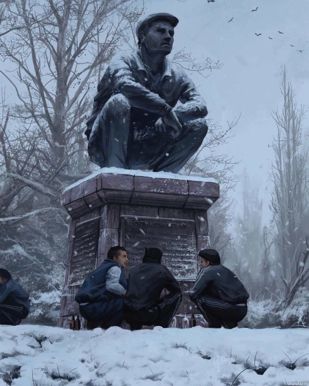 На картинке изображена группа мужчин, сидящих зимой у подножия статуи. Судя по всему, это одна из известных статуй, возможно, отсылка к "Мыслителю" Огюста Родена или другому подобному памятнику. На улице снежный день, голые деревья и приглушенная атмосфера. На этой сцене не видно птиц.