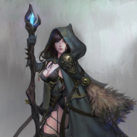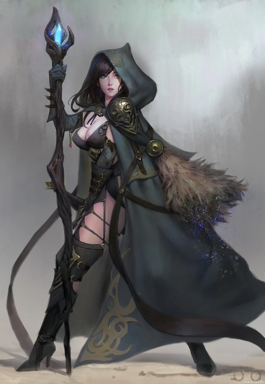 a confident pose. There are also magical-looking stones or gems attached to her cloak and