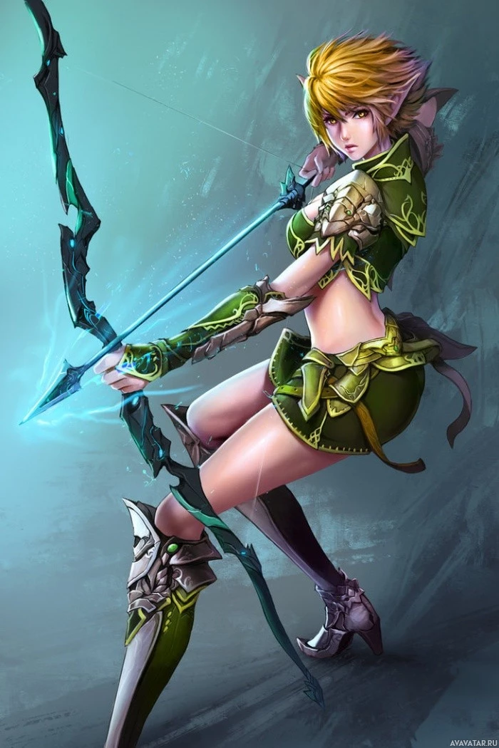 The image features a fantasy-style character that appears to be an elf. She is holding a bow and arrow, suggesting she might be a skilled archer or hunter in this