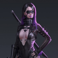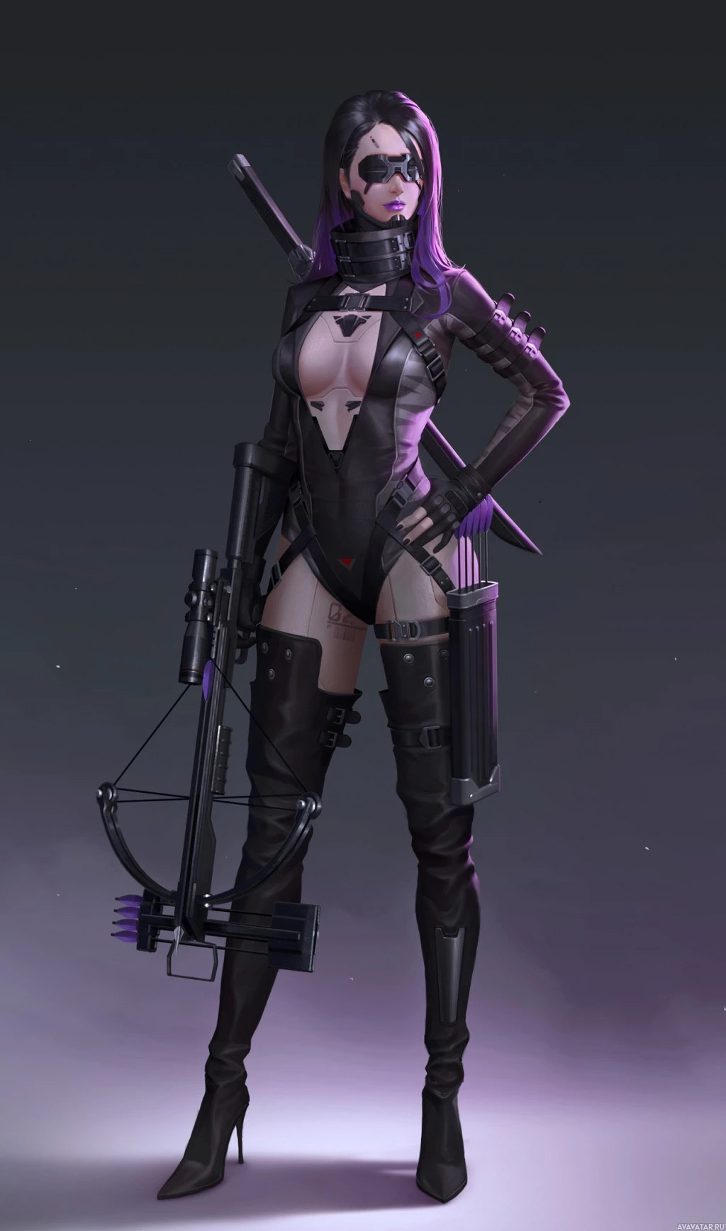 The image shows a character that appears to be a female with purple hair, dressed in
