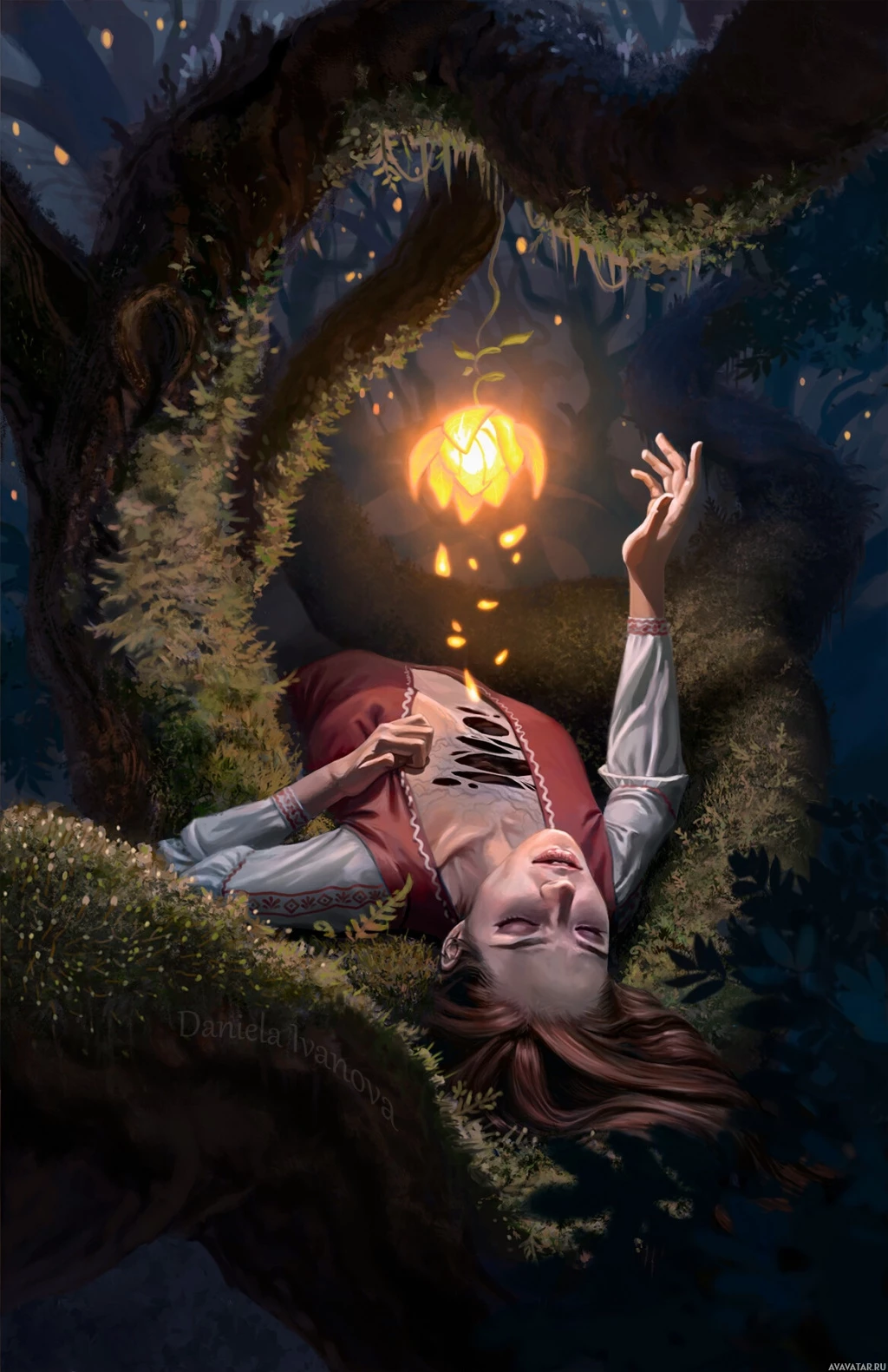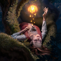 a fantasy setting, possibly a magical forest given the tree branch structure and the presence of what looks like an enchanted or magical atmosphere, evidenced by the floating candle and the small flame atop it. The character is dressed in a style that suggests medieval or elven attire.