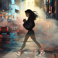 city street at night. She appears to be looking down, possibly at her phone, which she's holding in one hand. Her hair is dark and pulled back into a ponytail. The setting includes tall buildings with illuminated signs, streetlights casting