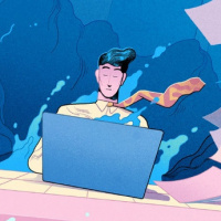 the surrounding environment looks like it's been hit by a tidal wave or flood, with debris and water all around. There are also some floating documents near the person. The colors are bright, suggesting an artistic or illustrative style rather than