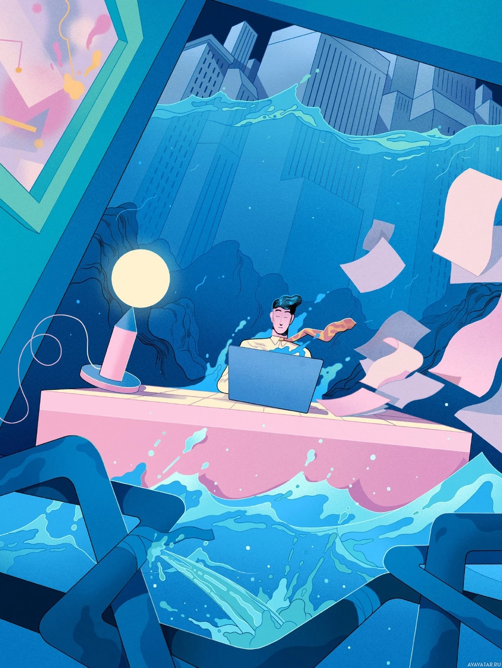The image depicts a person sitting at a desk with their eyes closed, wearing what appears to be a tie. The desk is submerged in water, and