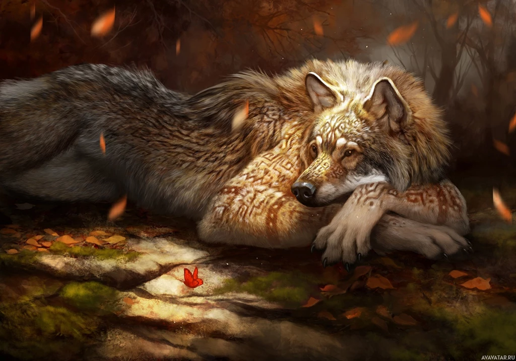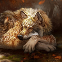 a fantastical scene featuring a werewolf. The werewolf, with its fur predominantly in shades of brown and white, is lying down on what appears to be leaf-strewn ground, possibly indicating