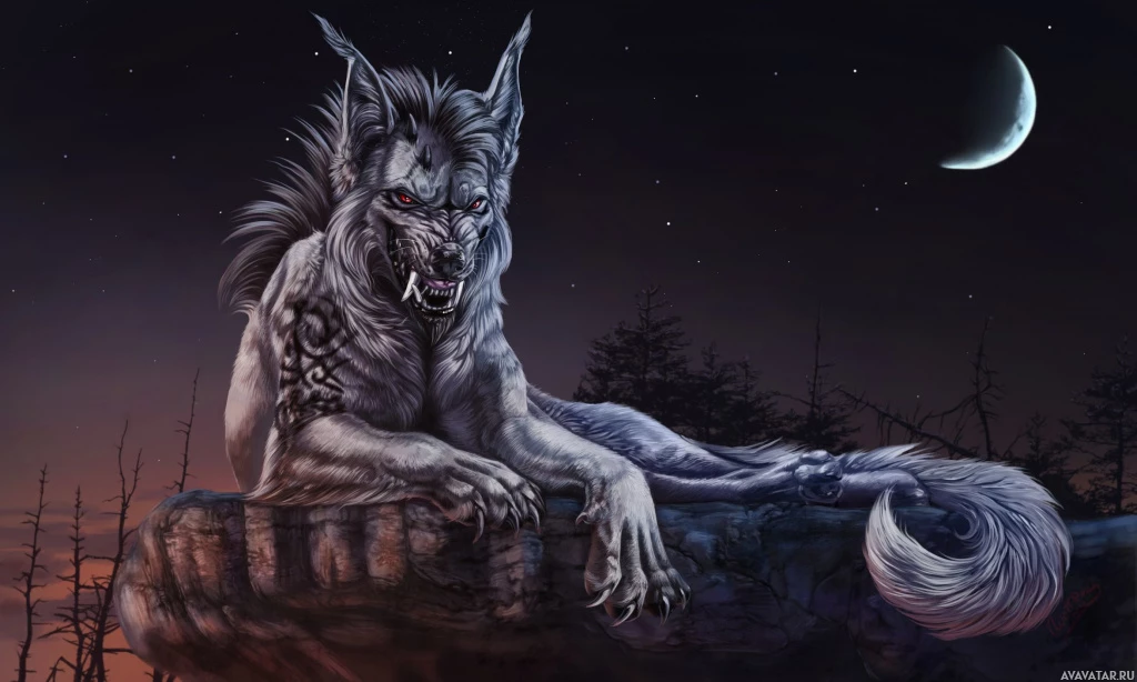 The image depicts a fantasy-style werewolf. The creature is anthropomorphic, with human-like features such as arms and legs, but has